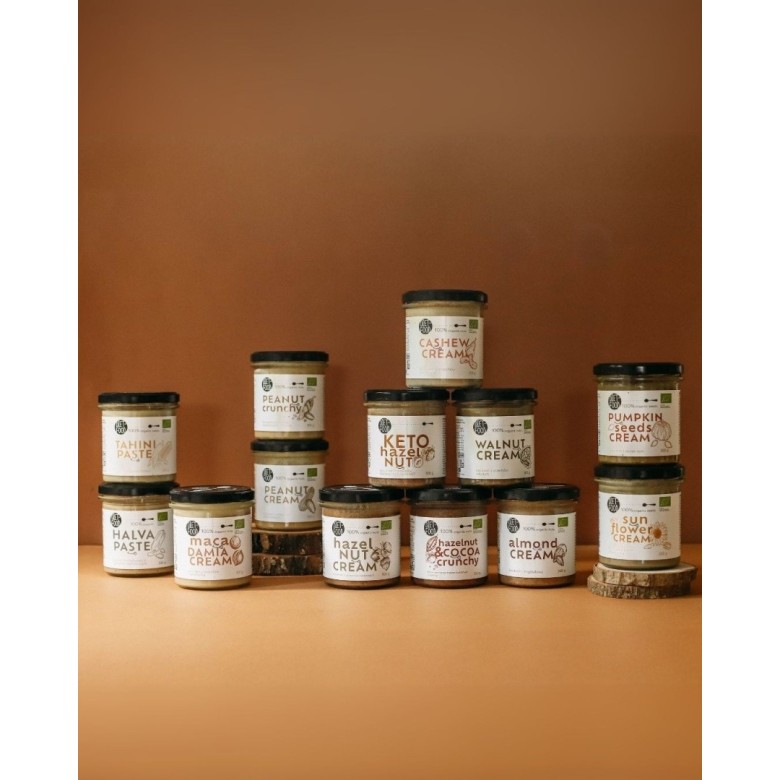 Traditional halva creams are a mix of various ingredients — both desirable, like sesame paste, and undesirable, such as large amounts of white sugar or, even worse, palm oil or preservatives in the form of flavor enhancers or chemical additives.