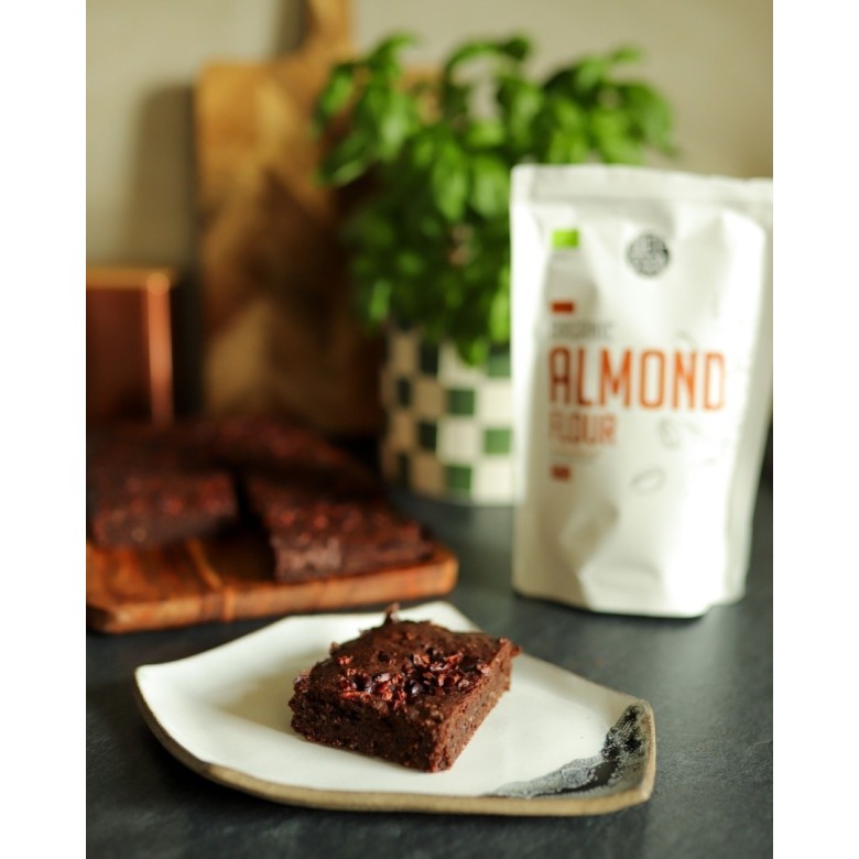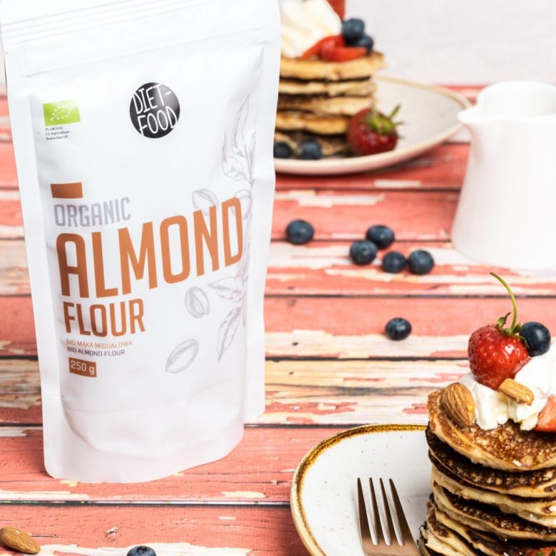 Organiczna mąka migdałowa to wysuszone i sproszkowane migdały blanszowane. Posiada przyjemny, lekko słodki smak. Wysoka zawartość białka (22 g / 100 g) sprawia, że jest silnie sycąca.